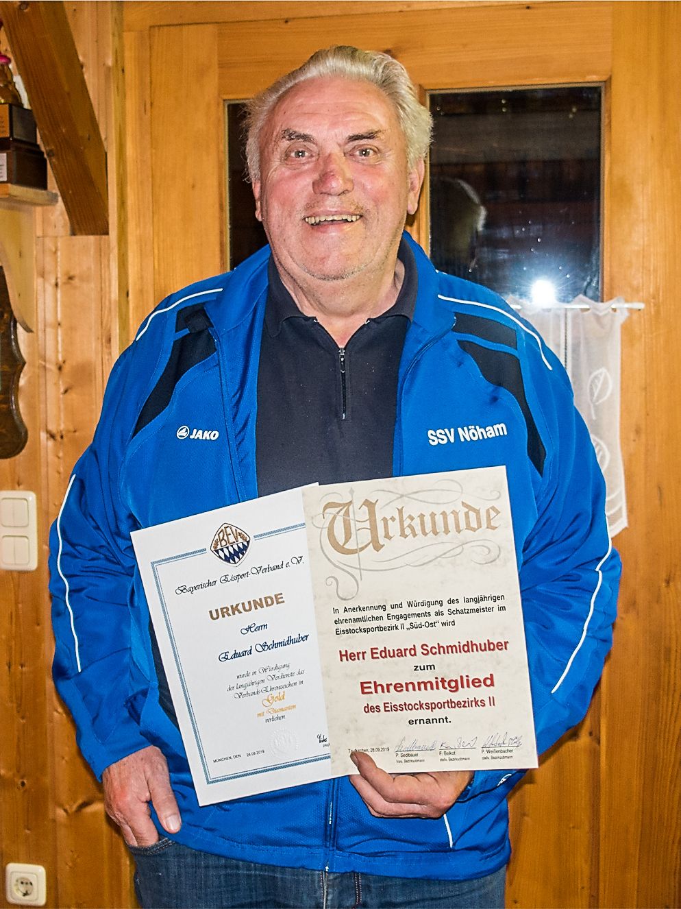 Bekannt weit über die Heimatgrenzen hinaus, ist Eduard Schmidhuber, ein absolutes Urgestein im Stocksport. Anlässlich der fälligen Neuwahlen des Bezirks II - Süd Ost hat Eduard Schmidhuber sein Amt als Schatzmeisters des Bezirks in jüngere Hände gegeben. Beim Bezirkstag 1982 in Marktl am Inn wurde er von den Delegierten zum Bezirksschatzmeister des Eisstocksportbezirks II Süd-Ost e.V. gewählt. Somit hatte er 37 Jahre dieses Amt inne gehabt. Während dieser Zeit hatte er in der Funktion des Kreisobmannes 204 und Bezirksschatzmeister die erste Satzung für Eisstocksportkreise im bayerischen Eissportverband entwickelt und zur Eintragung ins Vereinsregister gebracht. In all den Jahren wurde diese durch Gesetzesänderungen abgeändert. Es wurden dadurch nach und nach alle Eissportkreise zu eigenen Vereinen mit eigener Satzung. Im Bezirk hatte er federführend entscheidende Veränderung mitgetragen, besonders im Jugendbereich. Gewürdigt wurden nun beim Bezirkstag diese Verdienste mit entsprechenden Auszeichnungen. So steht auf der Urkunde in Anerkennung und Würdigung des langjährigen ehrenamtlichen Engagements als Schatzmeister im Eisstocksportbezirk II Süd-Ost e.V. wird  Herr Eduard Schmidhuber zum Ehrenmitglied des Eisstocksportbezirks II ernannt“. Ebenfalls bedacht wurde er mit der höchsten Auszeichnung des Bayerischen Eissportverbandes sprich mit dem Verbandsehrenzeichen in    "Gold mit Diamanten"  unterzeichnet vom Präsidenten Dieter Hildebrandt. Diese Auszeichnung ist die höchste, die der Bayerische Eissport-Verband vergibt. (gh)