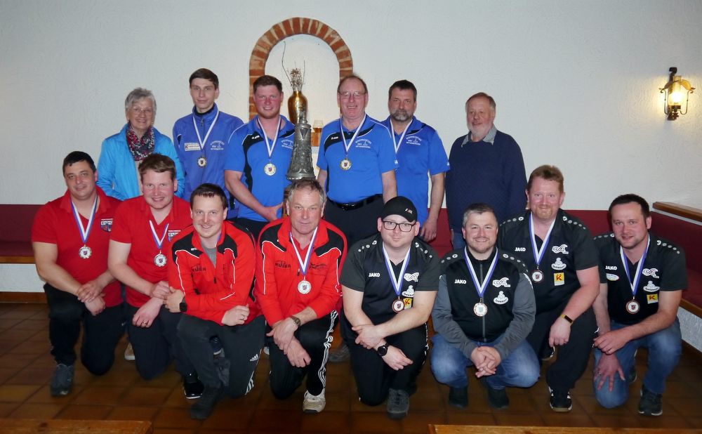 Erstmals ganz oben bei den Herren der ESV Mitterskirchen hinten von links mit Mathias Hahn, Thomas und Martin Schmuderer und Jürgen Rothaler und Edeltraud Plattner sowie Ernst Hecht. Vorne von links der EC Irging Simbach mit Manuel Niedermeier, Stefan und Peter Spielbauer und Johann Spateneder sowie der ESC Rattenbach mit Rainer Altmannshofer, Thomas Leibinger, Holger Kreuzeder und Christian Hoffmann