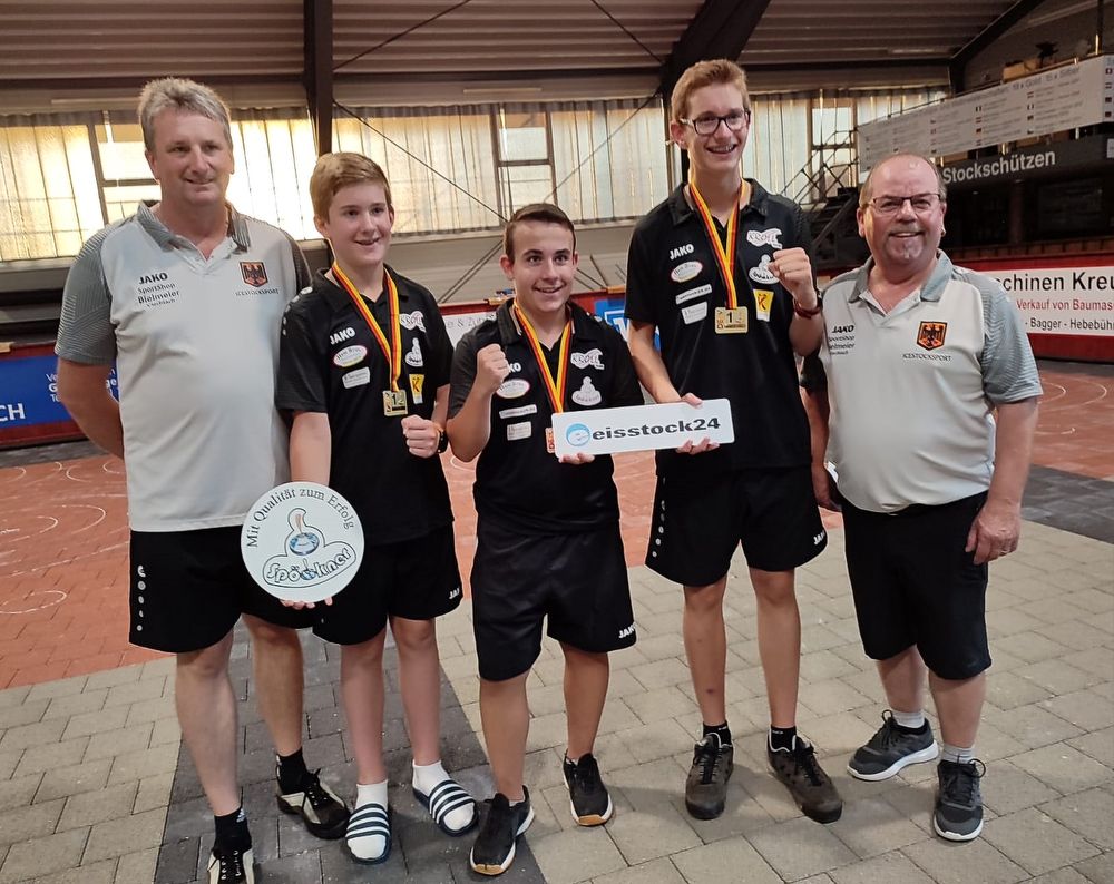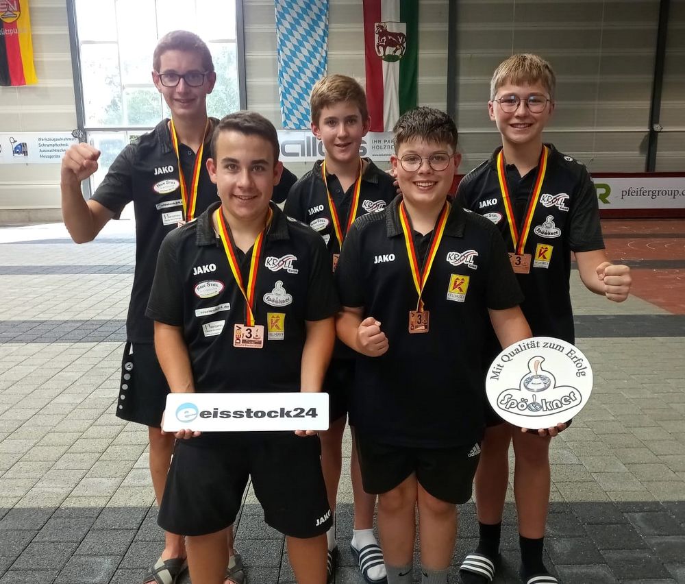 Mit großen Erwartungen ging natürlich der U 16 Nachwuchs des ESC Rattenbach als Deutscher Meister vom Vorjahr in die Deutsche Entscheidung und sie waren natürlich einer der Gejagten. In der Halle von Kühbach spielten Florian und Martin Kreuzeder, Marco Straubinger, Johannes Leibinger und Lukas Hanseder abermals einen bildsauberen Eisstock und mussten in den Gruppenspielen nur zweimal den Gegnern die Punkte überlassen mit Niederlagen gegen den FC Penzing 4:5 und DJK-SG Ramsau 4:9. Dagegen standen fünf Siege LS Andermannsdorf 10:2, EC Zaundorf 12:2, EC Lampoding 9:2, SV Höslwang 13:1 und SC Zell 8:6. So mussten sie mit 10:4 Punkten nur dem EC Lampoding mit 11:3 den Vortritt lassen. In den entscheidenden KO Spielen um den Titel verlor dann das Quartett zweimal zum Auftakt gegen den EC Lampoding mi 3:8 und mit 4:8 gegen die DJK-SG, Ramsau so dass am Ende der dritte Rang blieb. Deutscher Meister wurde mit einem 5:4 die DJK-SG Ramsau mit einem 5:4 über den EC Lampoding.