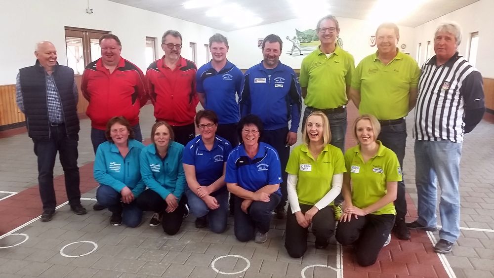 Fototext- Hahn – - die drei besten Mixed Teams - Stehend von links- Wettbewerbsleiter Karl Schwinghammer EC Irging Simbach, Andreas Obermaier, Werner Huber, Thomas Schmuderer, Jürgen Rothaler, Ewald Ritter, Bruno Freiberger und Schiedsrichter Rudolf Roiter vom DJK-SV Wittibreut - vorne von links Hildegard und Christina Spielbauer, Barbara Wimberger, Renate Schreiner, Jacqueline Ritter und Marie Luise Spielbauer.