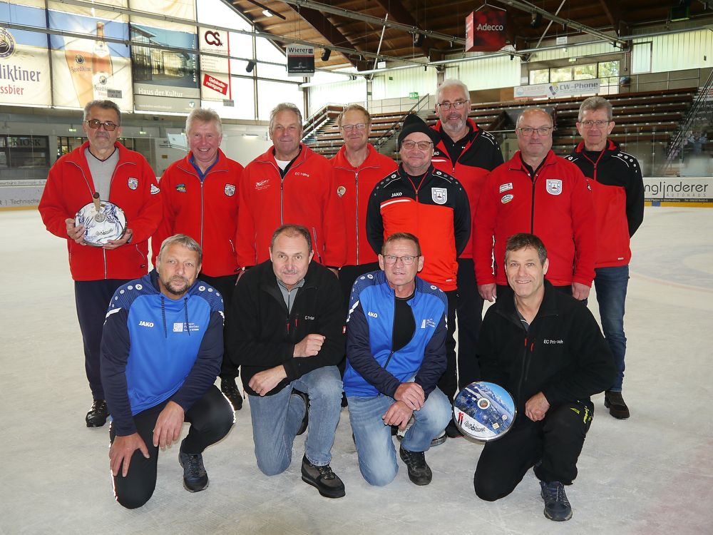 Die drei besten AH Teams – hinten von links der EC Irging-Simbach mit Werner Huber, Gottfried Bauer, Johann Spatender und Josef Spielbauer sowie der SC Reicheneibach mit Franz Eder, Bernhard Stelzig, Karl Sedlmaier und Heinrich Huber. Vorne der EC Prienbach mit Hartmut Egginger, Werner Sachs, Bernhard Geisberger und Siegfried Thalbauer.
