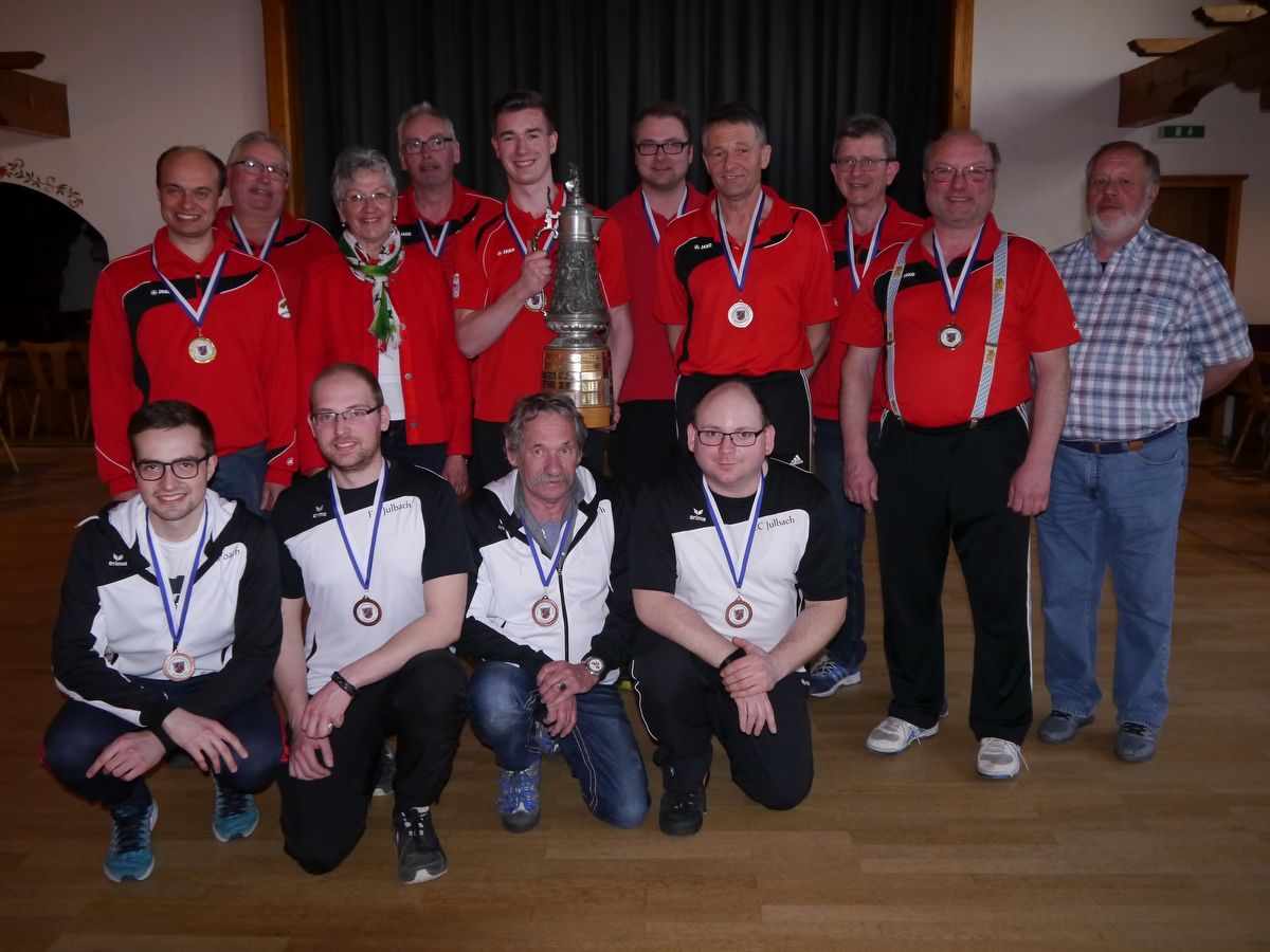 Die drei besten Herrenteams – hinten von links Franz Fußeder, Wolfgang Stelzig, Edeltraud Plattner, Bernhard und Michael Stelzig, Stefan Eder, Franz Guber, Heinrich Huber und Karl Sedlmaier sowie Kreisobmann Ernst Hecht – vorne von links der EC Julbach mit Benjamin Springer, Stefan Achatz, Franz Hermann und Rainer Altmannshofer