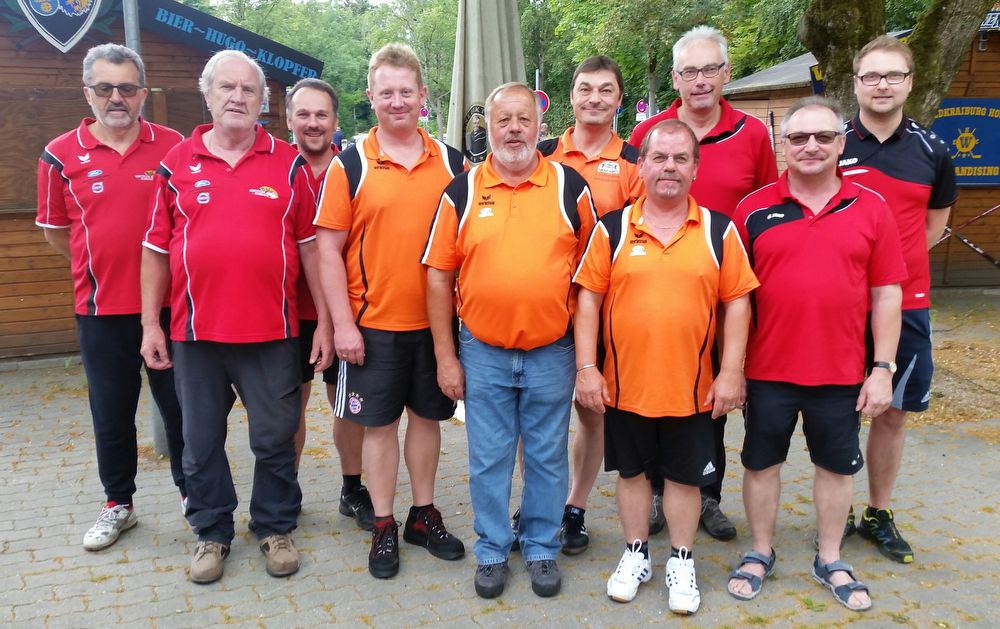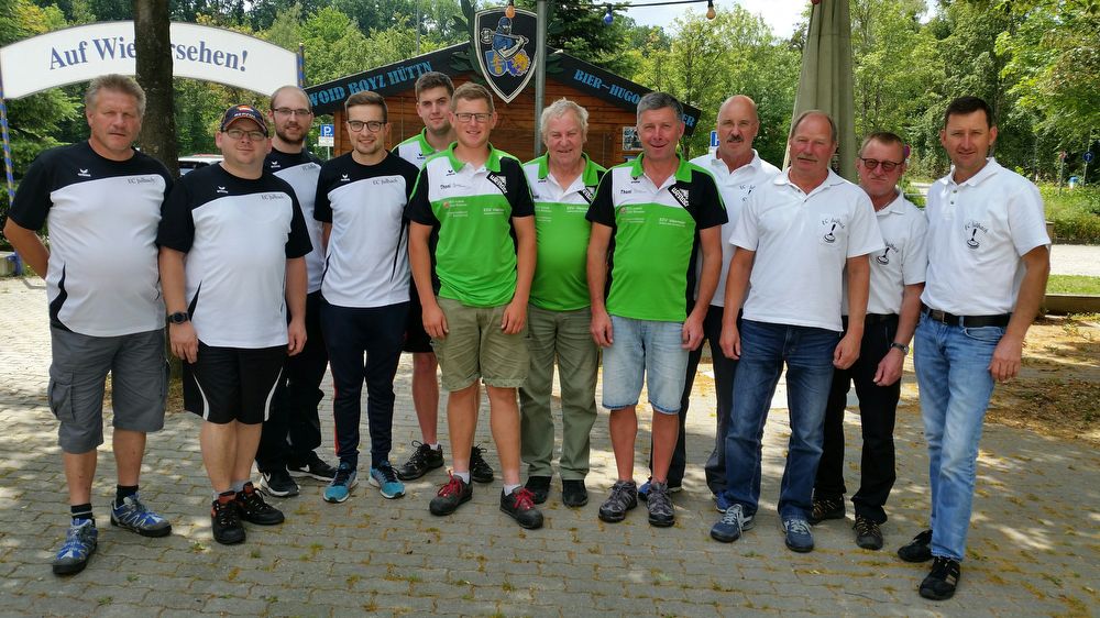 Die drei Besten des B Pokales und Aufsteiger in den A Pokal – von links: der EC Julbach I mit Franz Watzenberger, Rainer Altmannshofer, Stefan Achatz und Benjamin Springer, der SSV Zimmern mit Markus Brunnwieser, Mathias Holzmüller, Franz Brunner und Günther Brunnwieser sowie der EC Julbach Ii mit Arnold Finger, Johann Jäger, Helmut Nebauer und Wilhelm Schmeckenbecher-Seitz.